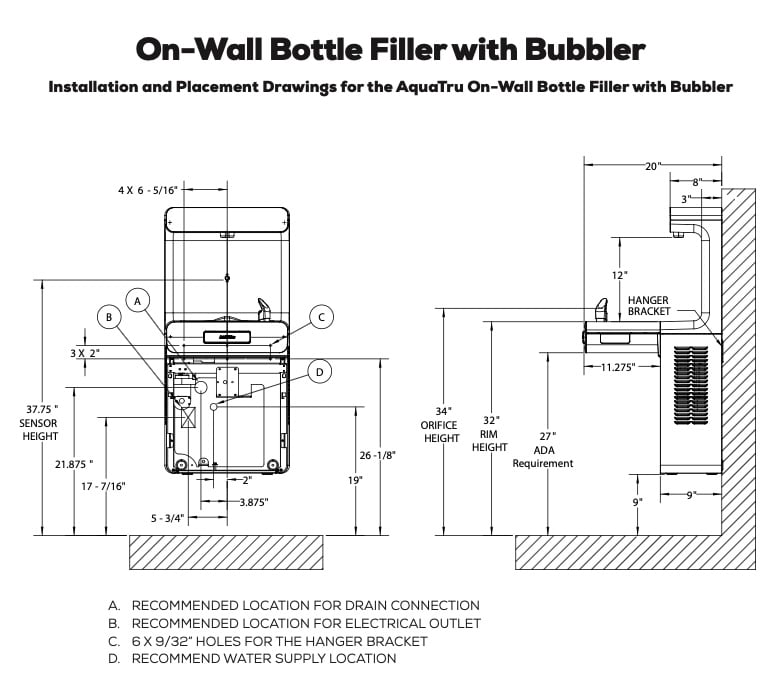 What are the dimensions of the On-Wall Bottle Filler with Bubbler?